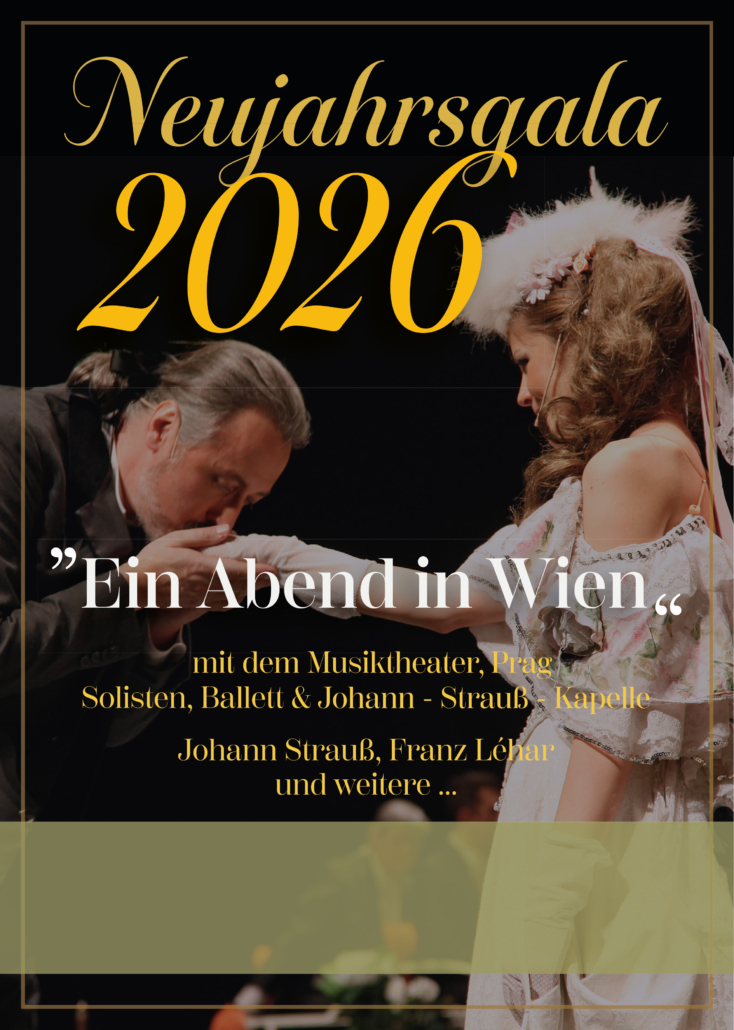 Läuten Sie das neue Jahr festlich und schwungvoll mit der hochkarätigen Neujahrsgala des Musiktheater Prag ein! „Ein Abend in Wien“ präsentiert eine spritzige Auswahl der unvergänglichen Melodien von Johann Strauß und Franz Lehár.